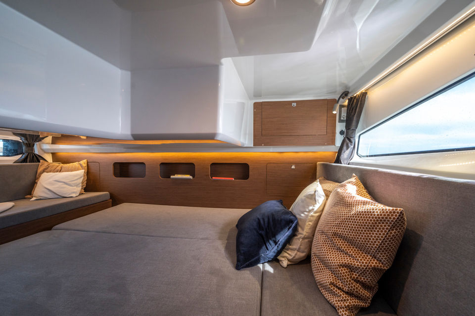 Unutrašnjost broda udobno prima do 7 osoba, s master kabinom, gostinskom kabinom s bračnim i jednokrevetnim ležajem te pretvorivim ležajem u salonu. Visokokvalitetni završni detalji, praktični spremnici i moderna oprema, uključujući klimatizaciju, hladnjake na flybridgeu i donjoj palubi te cijeli 220V električni krug, osiguravaju maksimalni komfor tijekom plovidbe.