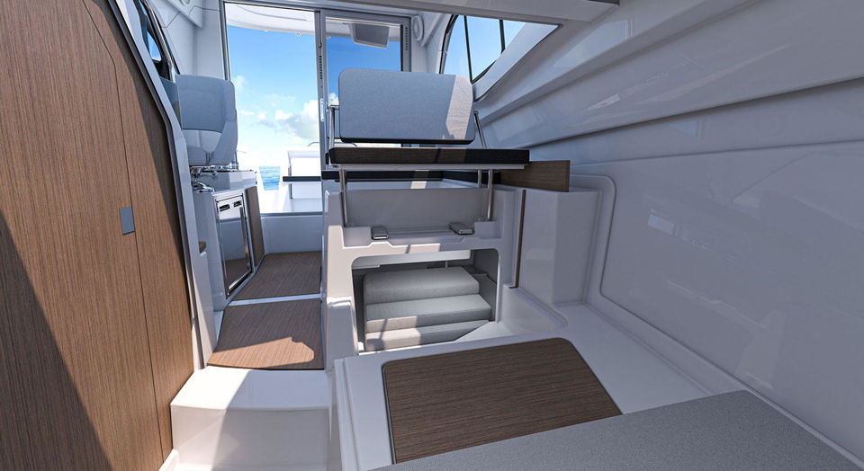 Salon pruža udobnost i modularnost: okretna kormilarska stolica i preklopna klupa suvozača omogućuju različite konfiguracije, dok veliki prozori pružaju panoramski pogled i izvrsnu ventilaciju. Luksuzna kuhinja s plinskim kuhalom i hladnjak od 42 L osiguravaju praktičnost, a paket sustava vode uključuje morski WC sa spremnikom, sudopere i kokpit tuš.