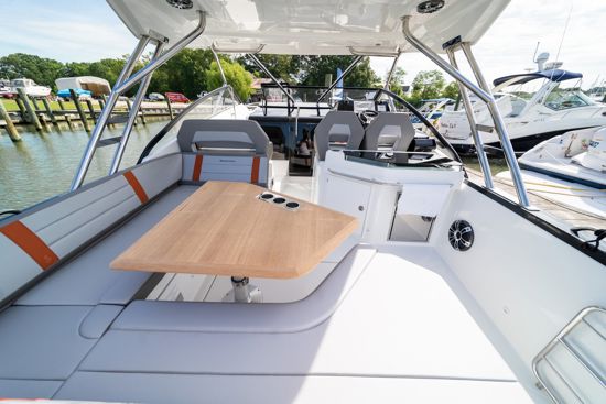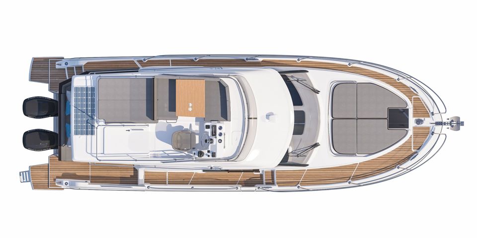 Prostrani, funkcionalni kokpit nudi podesiva sjedala, sunčalište na pramcu za tri osobe i ambijentalnu rasvjetu. Praktična oprema uključuje električno sidreno vitlo, Zipwake automatske flaps ploče, 220 V priključak za obalu s punjačem, hladnjak u kokpitu i bojler 25 L.