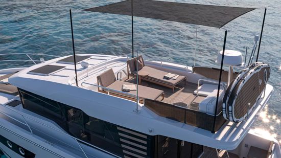 Sedan verzija zamjenjuje flybridge produženim krovom koji omogućuje dodatni višenamjenski prostor – za odmor/ sunčanje, odlaganje opreme ili ugradnju opcionalnih solarnih panela. Sklopivi stol u kokpitu sa stolicama te Black tende i zavjese stvaraju elegantan i zaštićen vanjski lounge prostor.