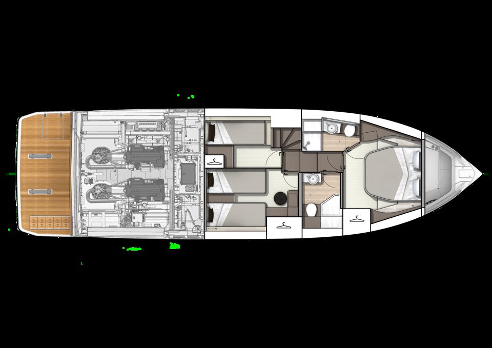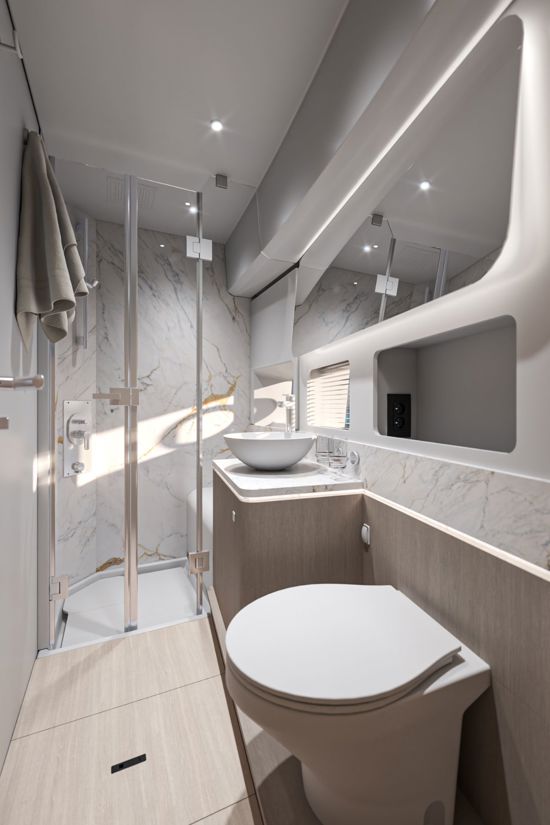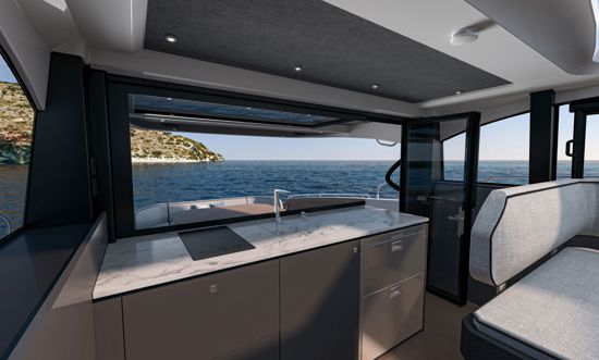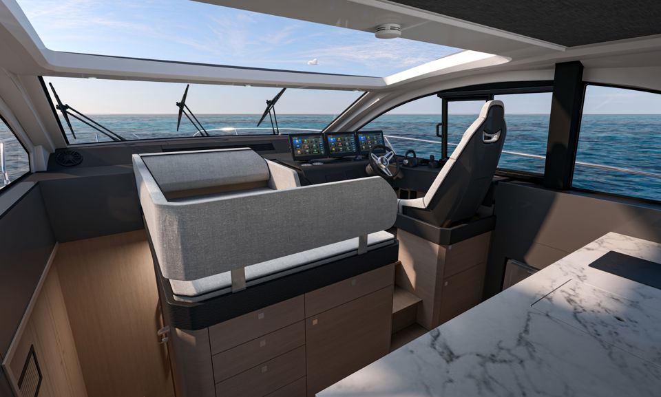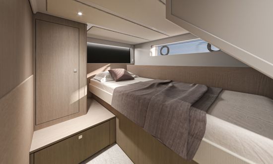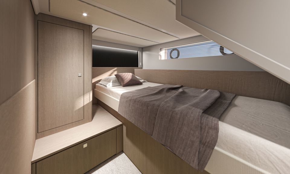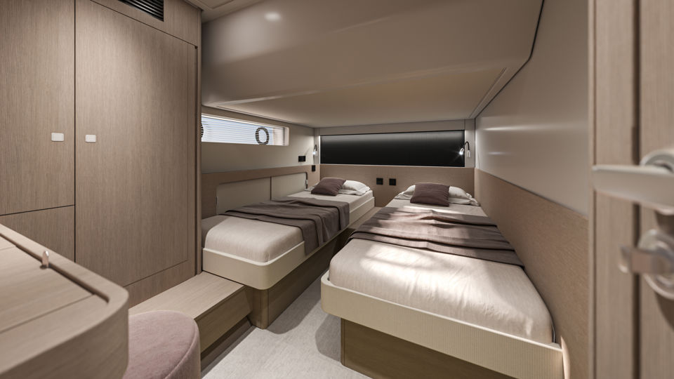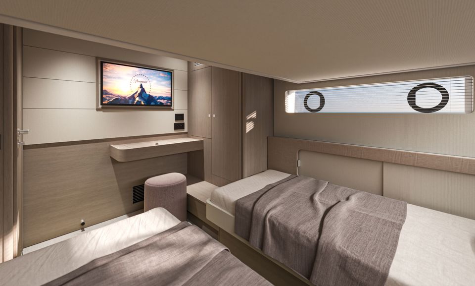 Unutrašnjost odiše svjetlom i prozračnošću — velike staklene površine i otvoreni raspored kokpita i salona stvaraju dojam povezanosti s morem i okolnim prostorom. Na donjoj palubi, vlasnička kabina pune širine trupa i svijetla prednja kabina nude iznimnu udobnost, dok fleksibilan raspored kabina za goste omogućuje ugodno višednevno krstarenje.