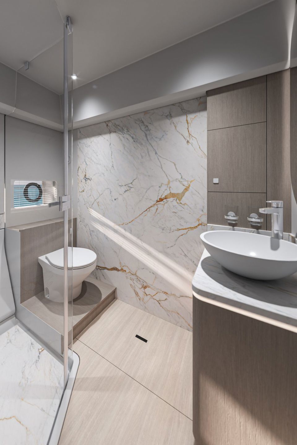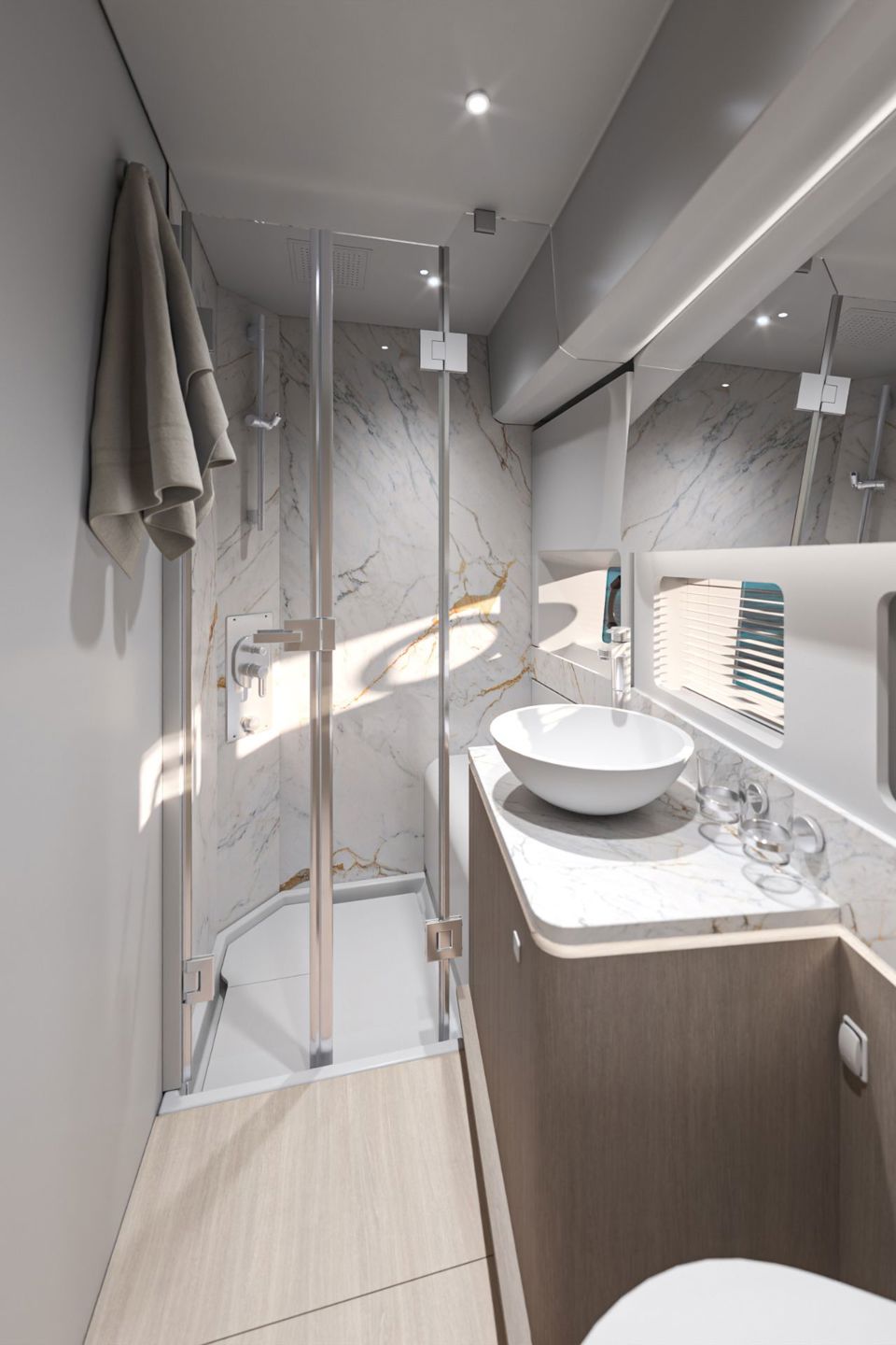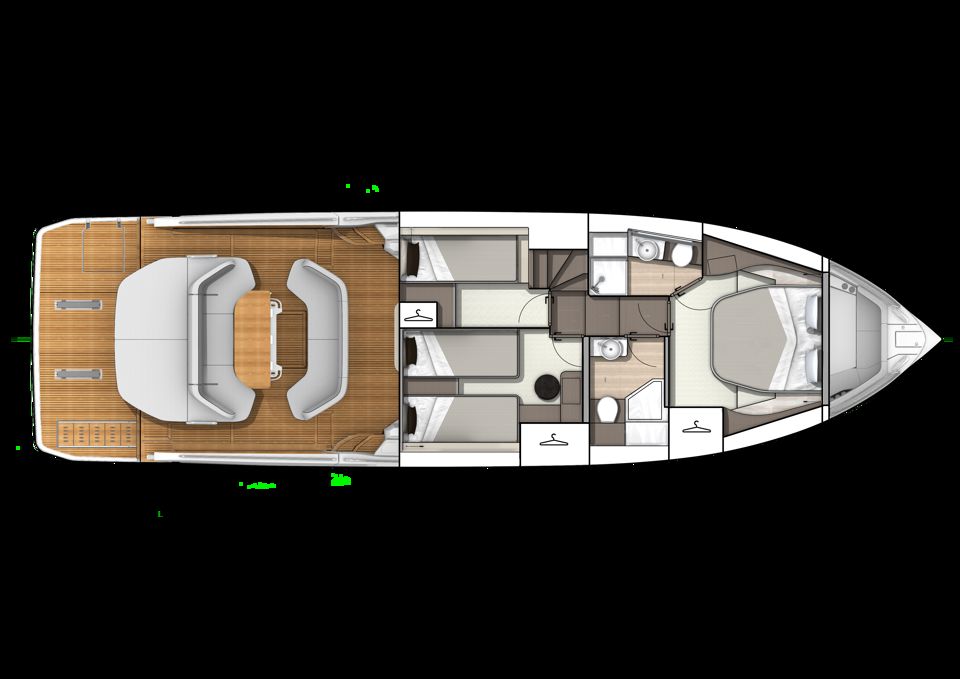 Unutrašnjost odiše svjetlom i prozračnošću — velike staklene površine i otvoreni raspored kokpita i salona stvaraju dojam povezanosti s morem i okolnim prostorom. Na donjoj palubi, vlasnička kabina pune širine trupa i svijetla prednja kabina nude iznimnu udobnost, dok fleksibilan raspored kabina za goste omogućuje ugodno višednevno krstarenje.