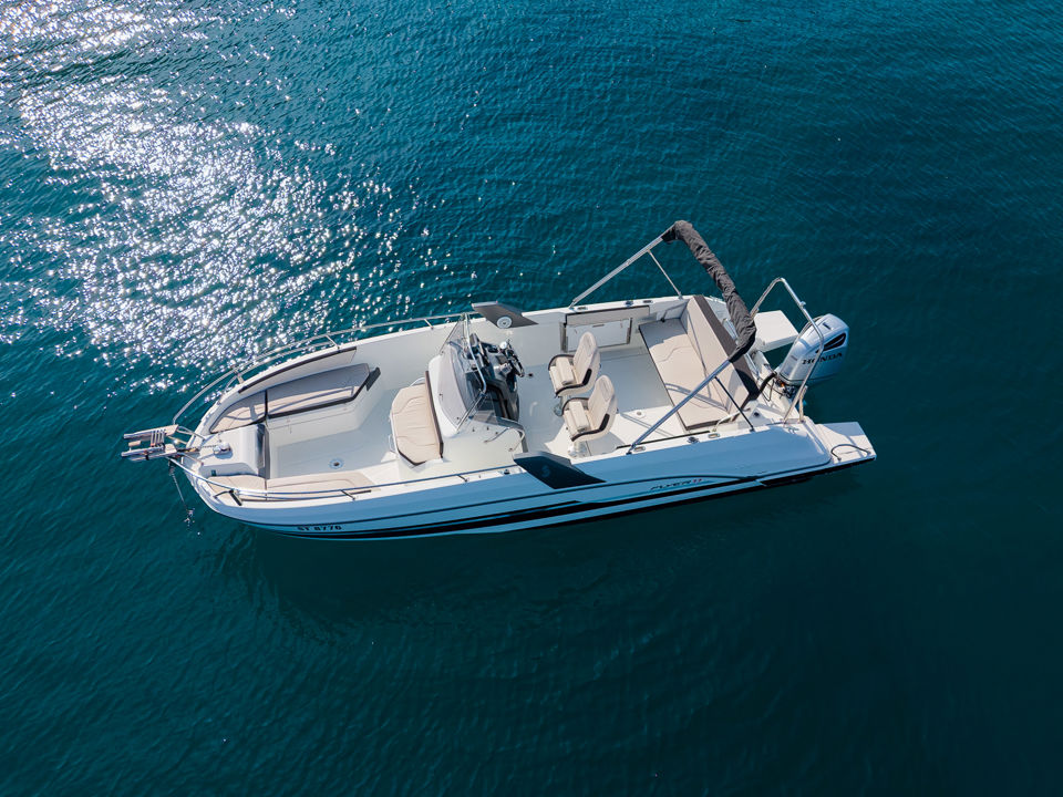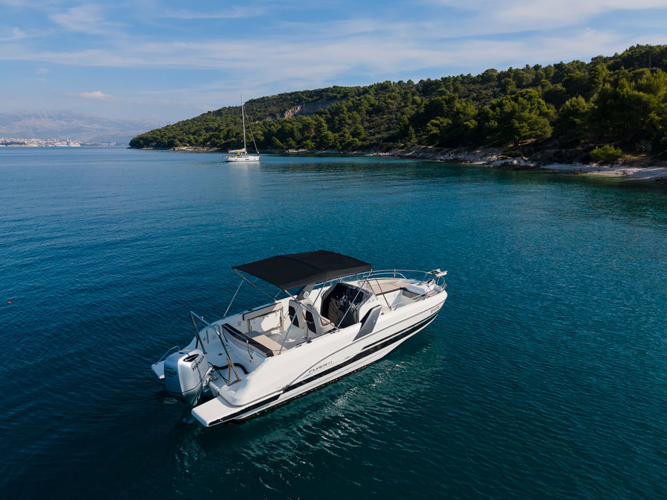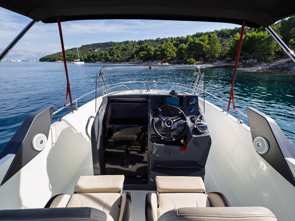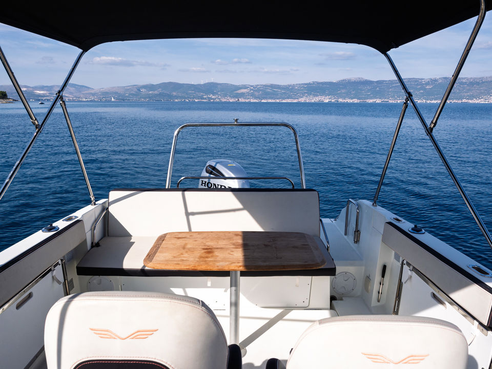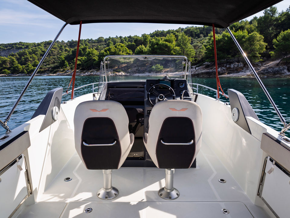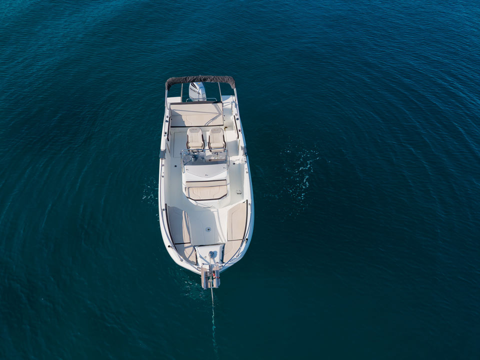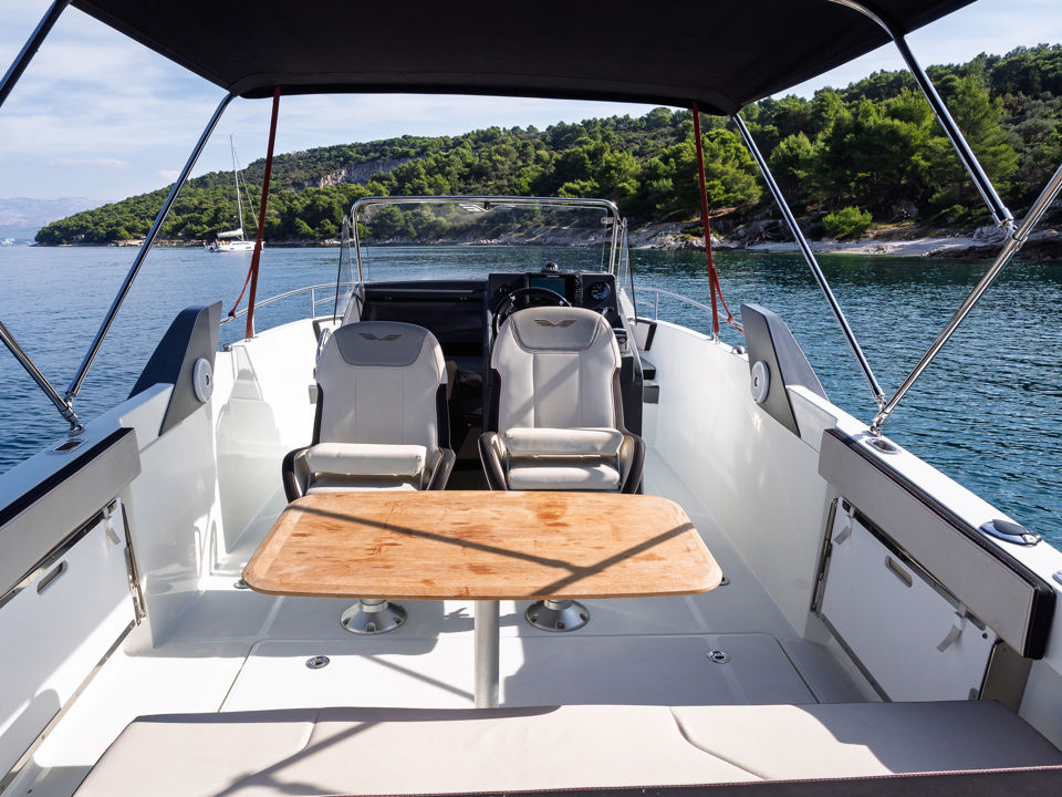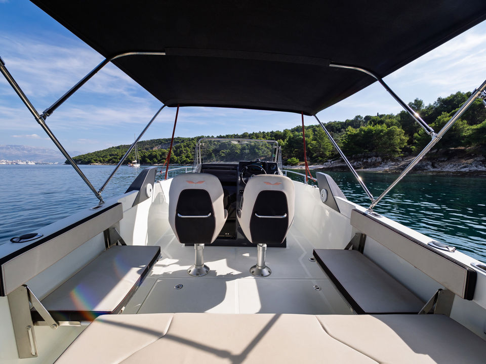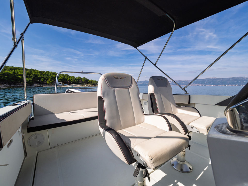 Plovilo je prostrano i udobno, opremljeno centralnom konzolom koja povećava slobodan prostor za putnike, a paluba nudi sve pogodnosti za cijeli dan na moru – od mjesta za odmor i objedovanje do praktičnih platformi za kupanje i tuširanja.