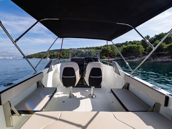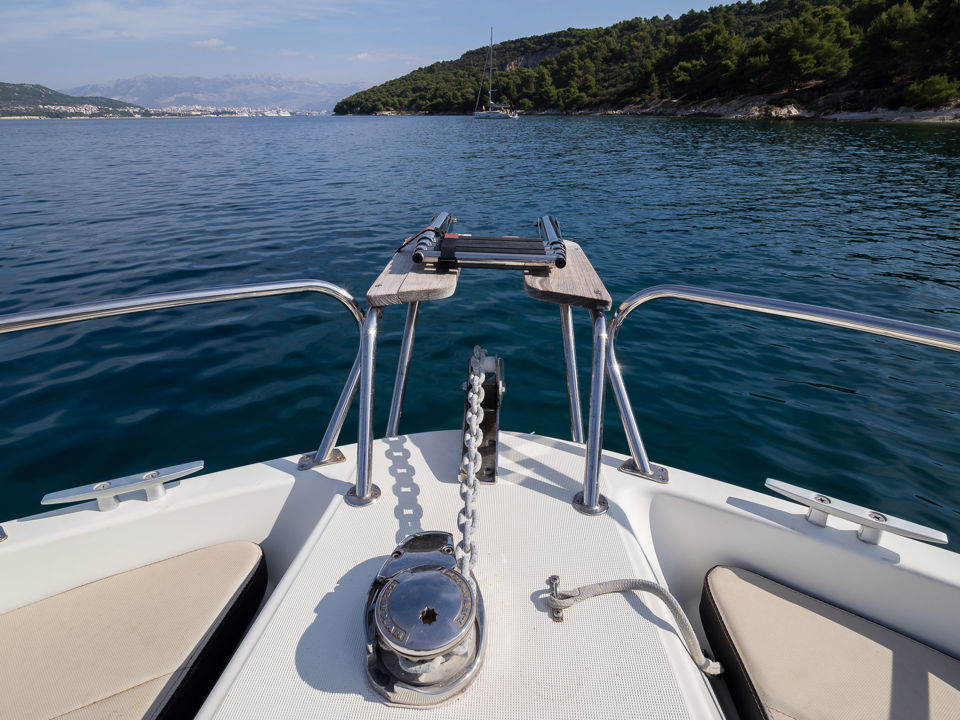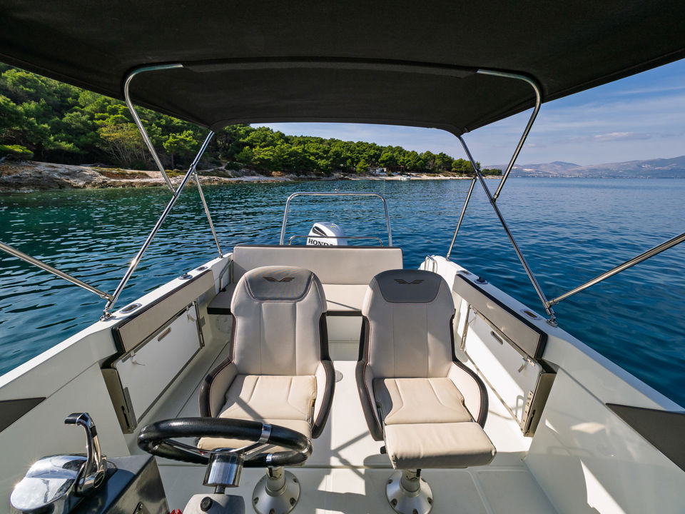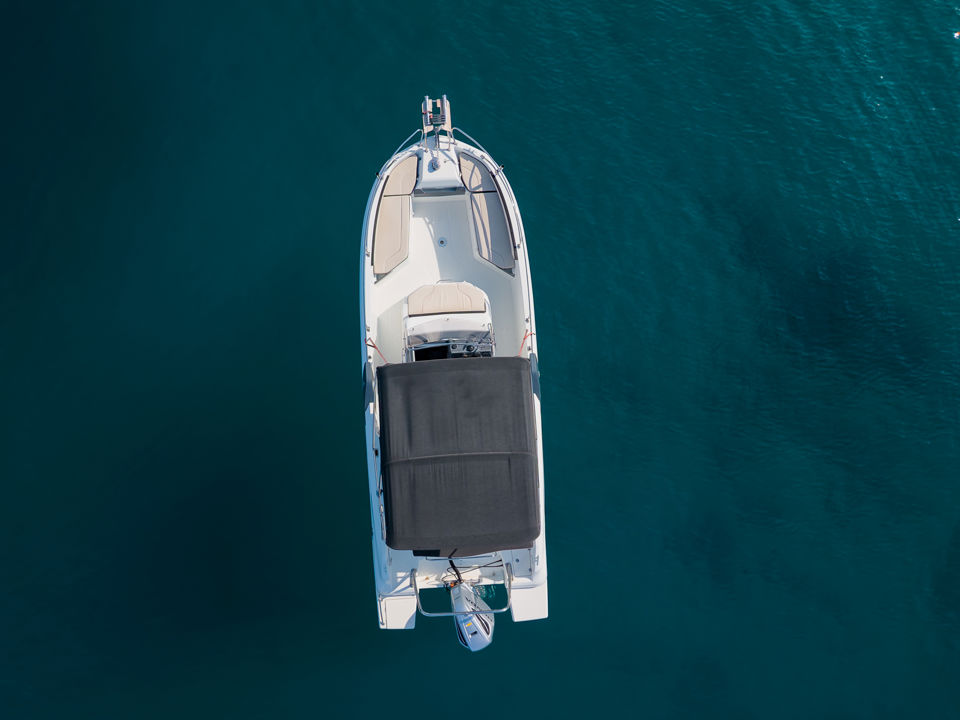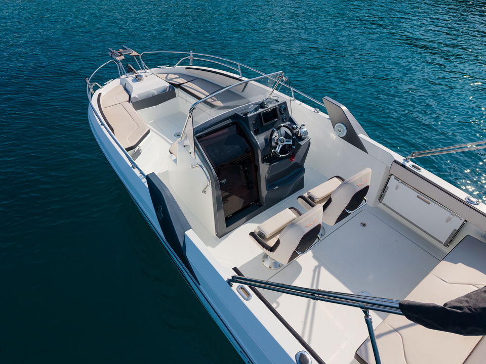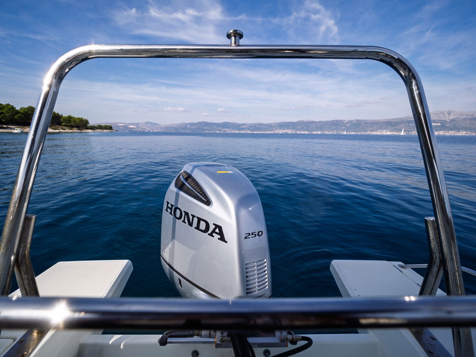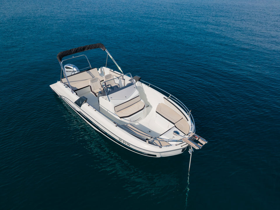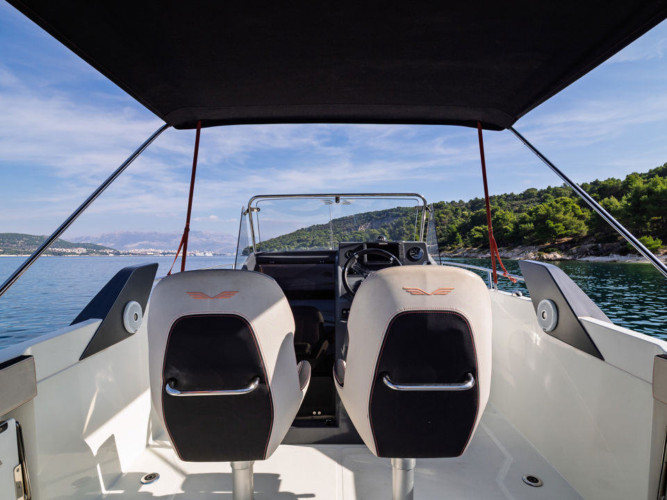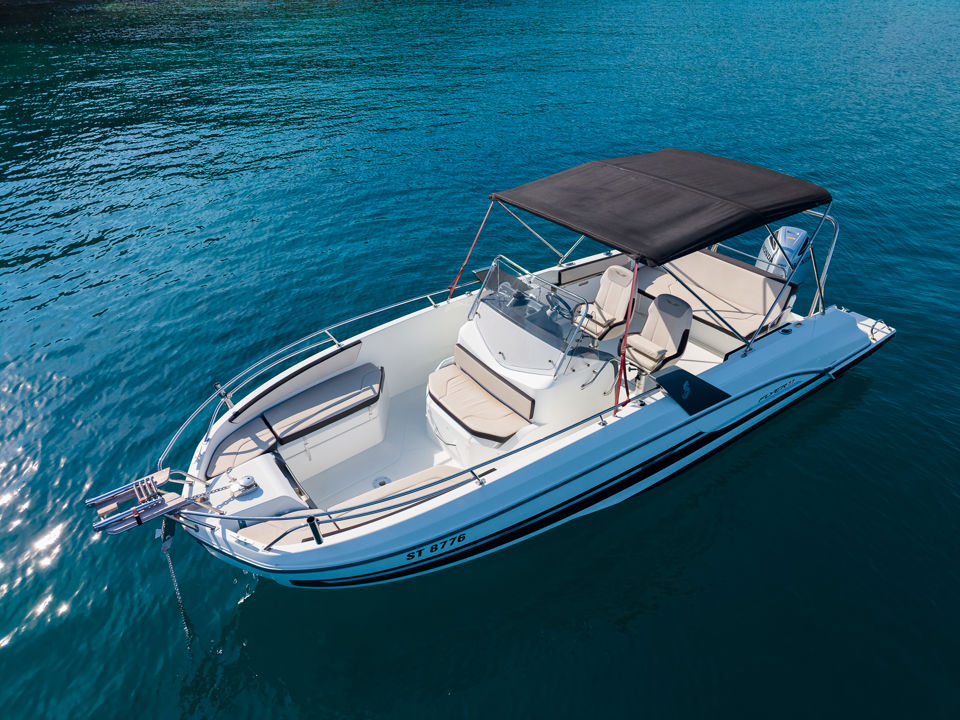 Plovilo je prostrano i udobno, opremljeno centralnom konzolom koja povećava slobodan prostor za putnike, a paluba nudi sve pogodnosti za cijeli dan na moru – od mjesta za odmor i objedovanje do praktičnih platformi za kupanje i tuširanja.