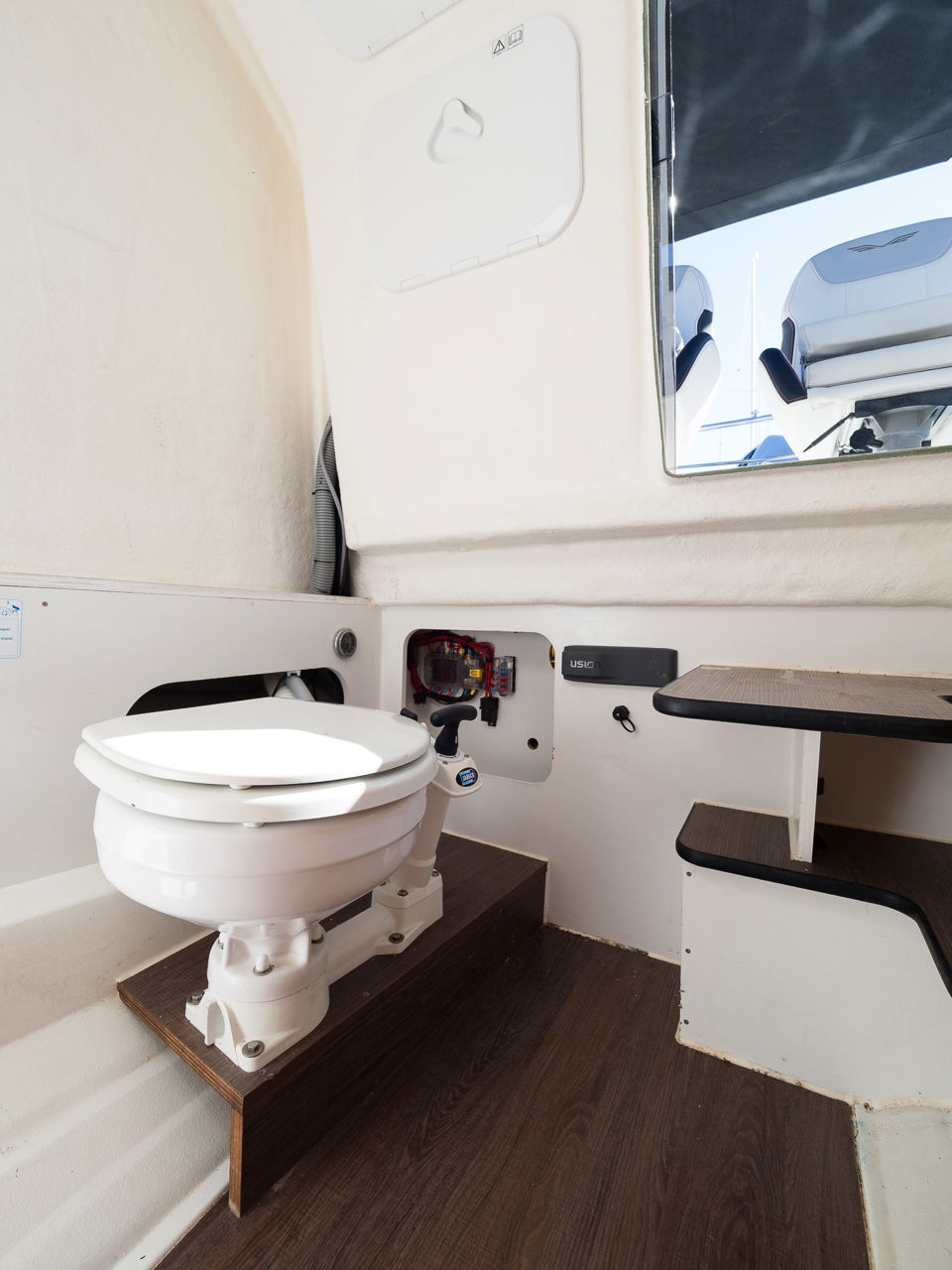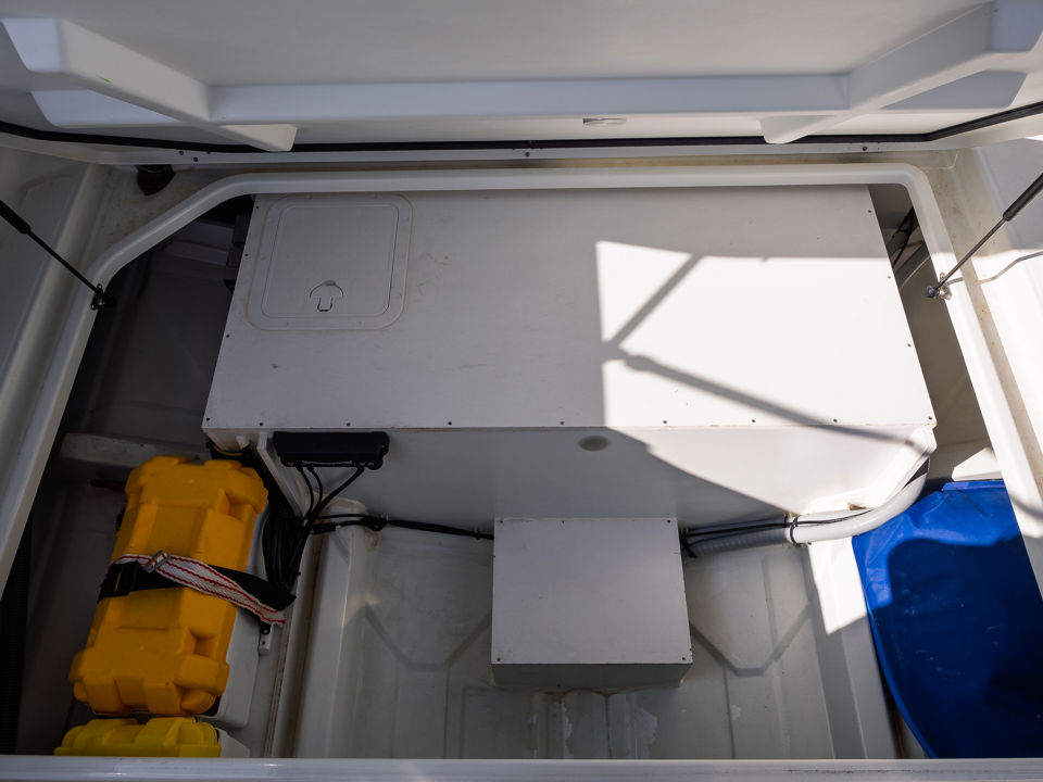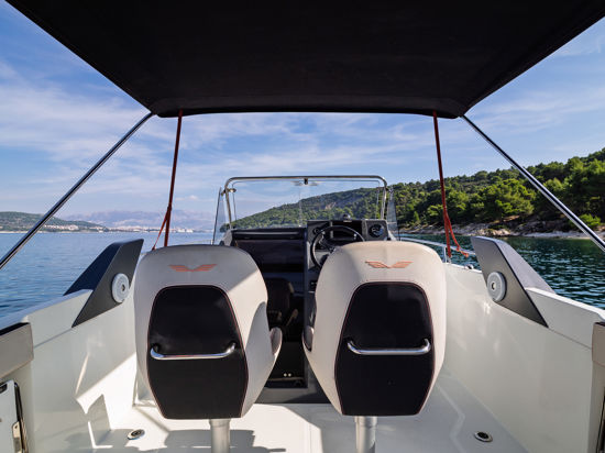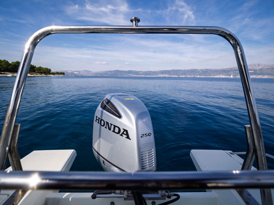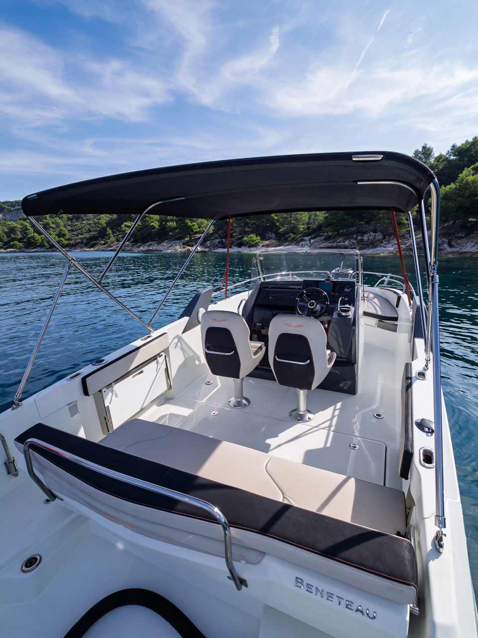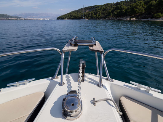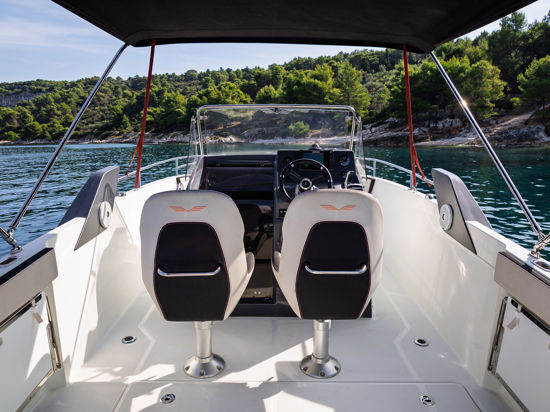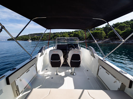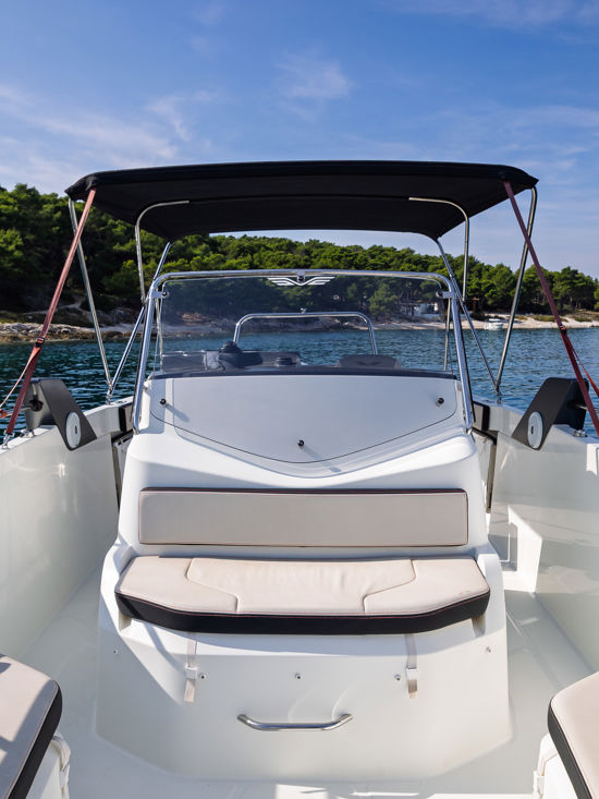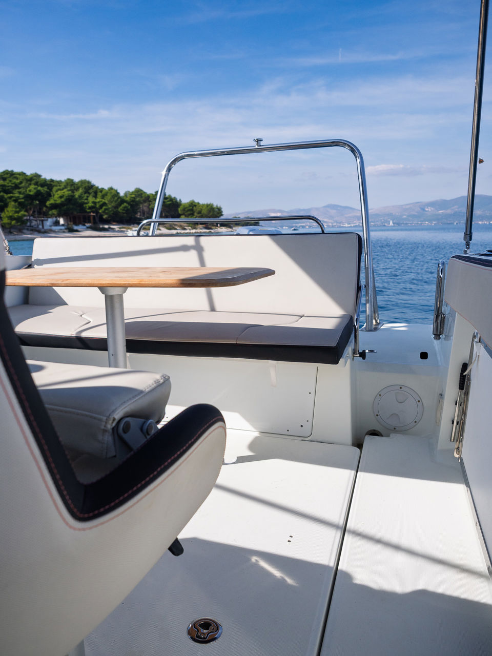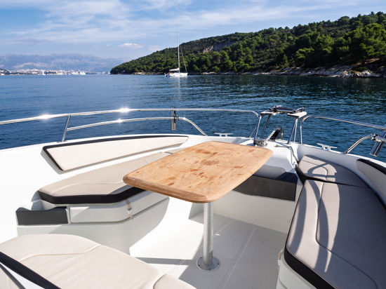 Plovilo je prostrano i udobno, opremljeno centralnom konzolom koja povećava slobodan prostor za putnike, a paluba nudi sve pogodnosti za cijeli dan na moru – od mjesta za odmor i objedovanje do praktičnih platformi za kupanje i tuširanja.