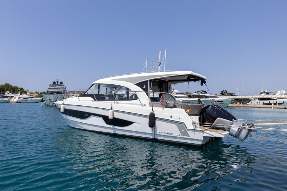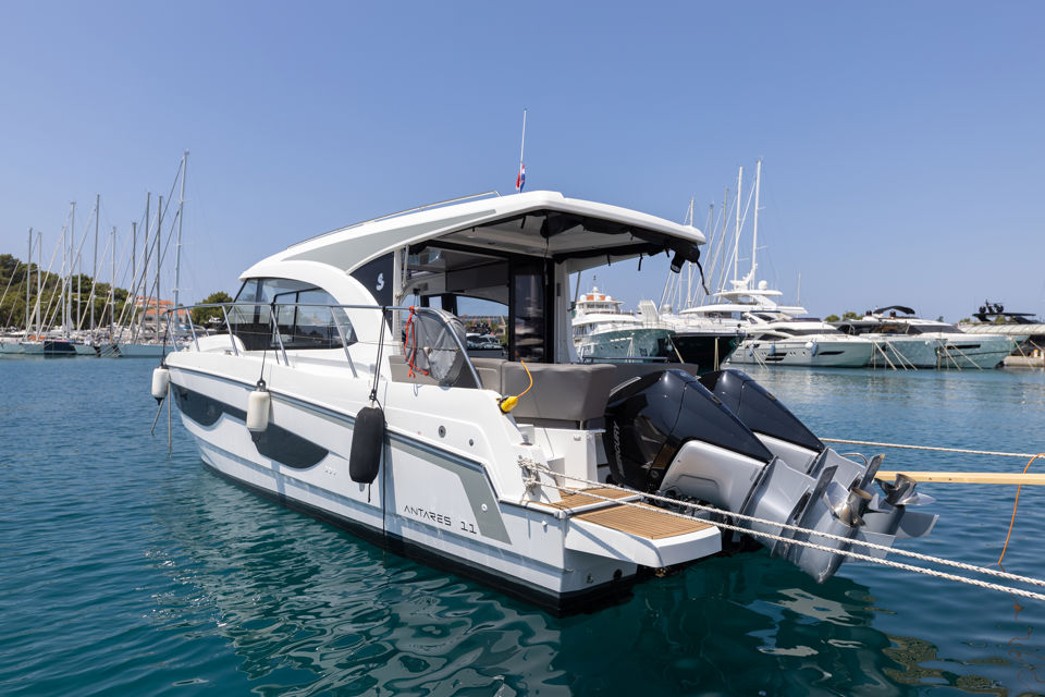 The Antares 11 is a flagship 11-metre family cruiser, used just two summer seasons and in excellent condition. Powered by twin Mercury F300 V8 DTS AMS engines with joystick control, it offers effortless handling and top performance.