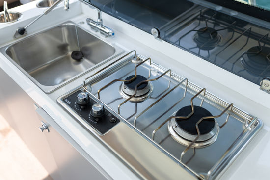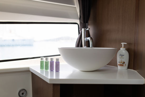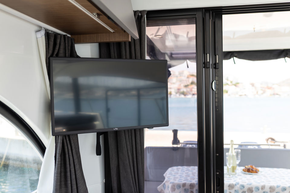 Inside, enjoy the Comfort Package, Elegance upholstery, additional salon berth, diesel heating, refrigerator , water heater, TV, sunshades, and LED indirect lighting.