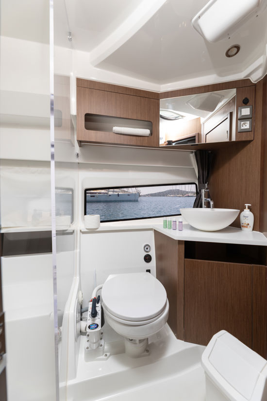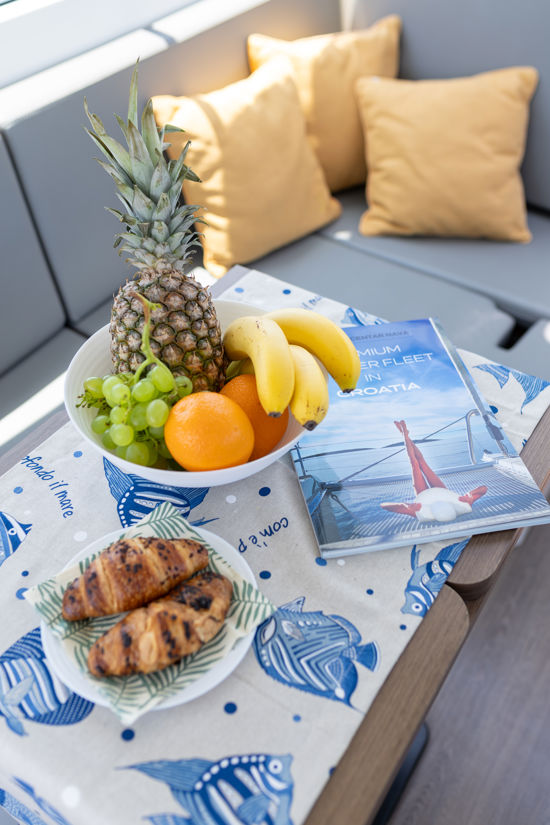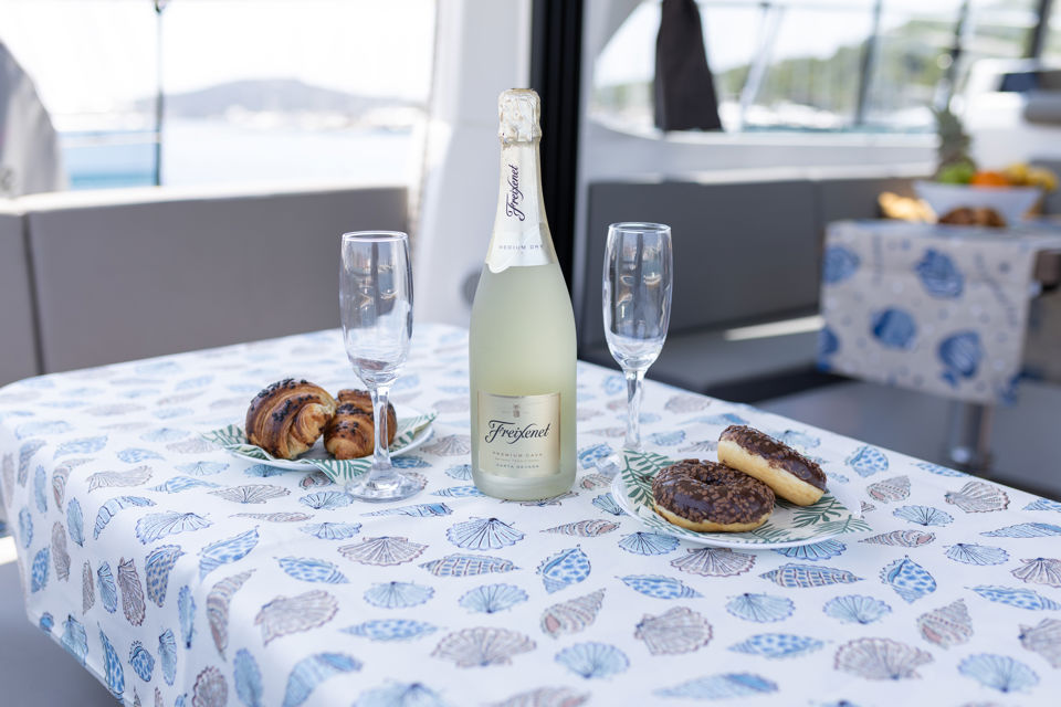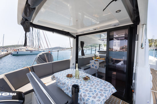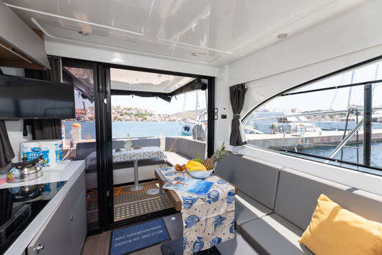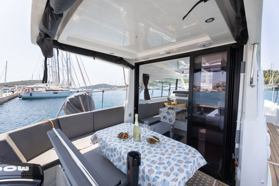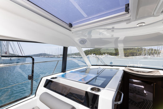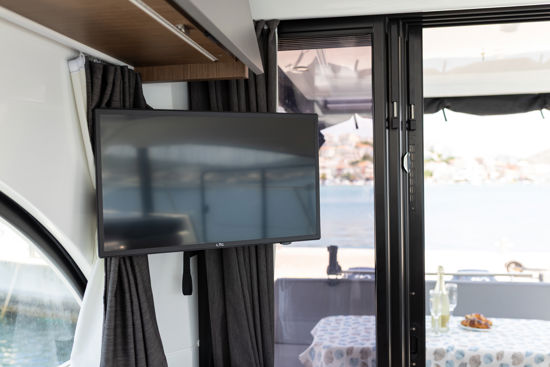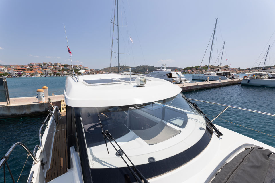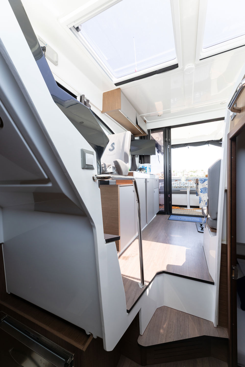 The deck features electric anchor windlass, bow thruster, extended stern platforms, underwater lights, flexi teak decking, Minn Kota trolling motor, and solar panels that provide a silent, eco-friendly power source for longer stays at anchor.