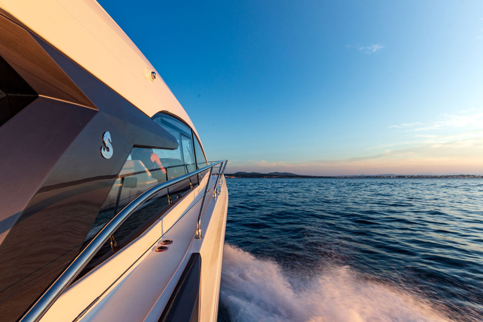Equipped with Dolce Vita cockpit upholstery, Comfort Trim Level, Sport Chic Plus V3C Pack, Premium Foredeck Pack, and Electronic Pack, this GT45 is built for luxury. Key features include a hydraulic swim platform with dinghy system, generator 7.5 kVA, bow thruster, air conditioning 24,000 BTU, Zipwake auto trim tabs, underwater lights, and Irodeck slatted cockpit floor.