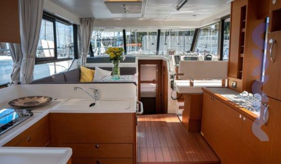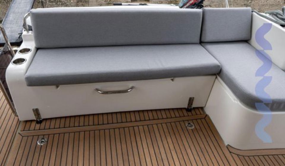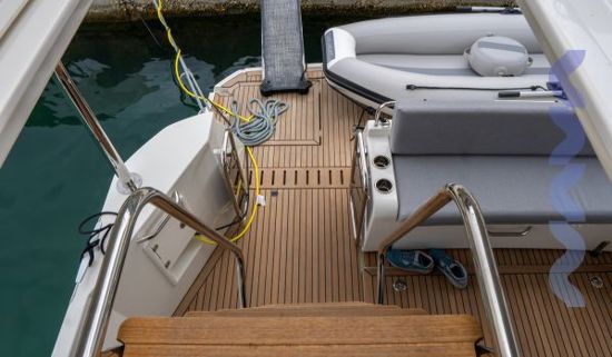 Her layout is designed for flexible living, offering 3 cabins and 2 bathrooms, with additional convertible berthing options to comfortably accommodate family and guests. The interior saloon and generous exterior areas create a seamless onboard lifestyle, enhanced by extensive teak detailing across the cockpit, side decks, flybridge, and aft platform.