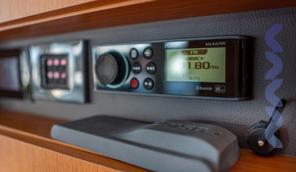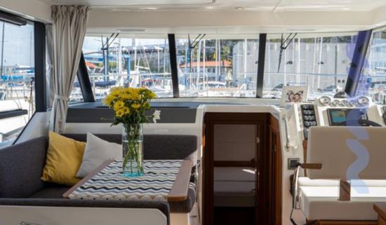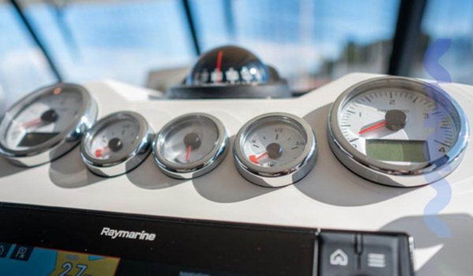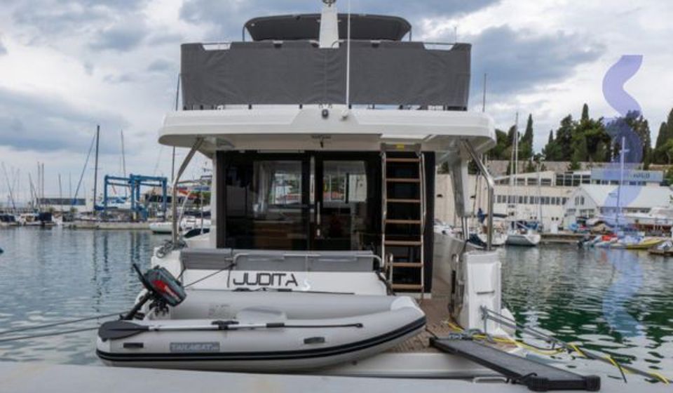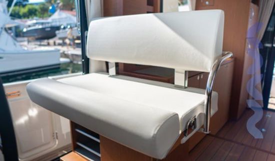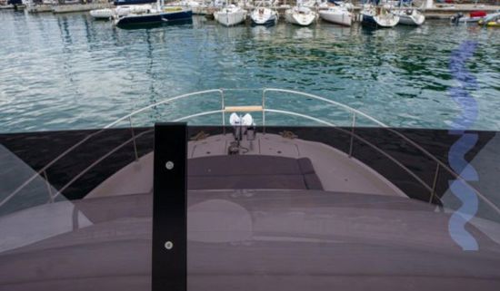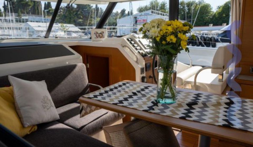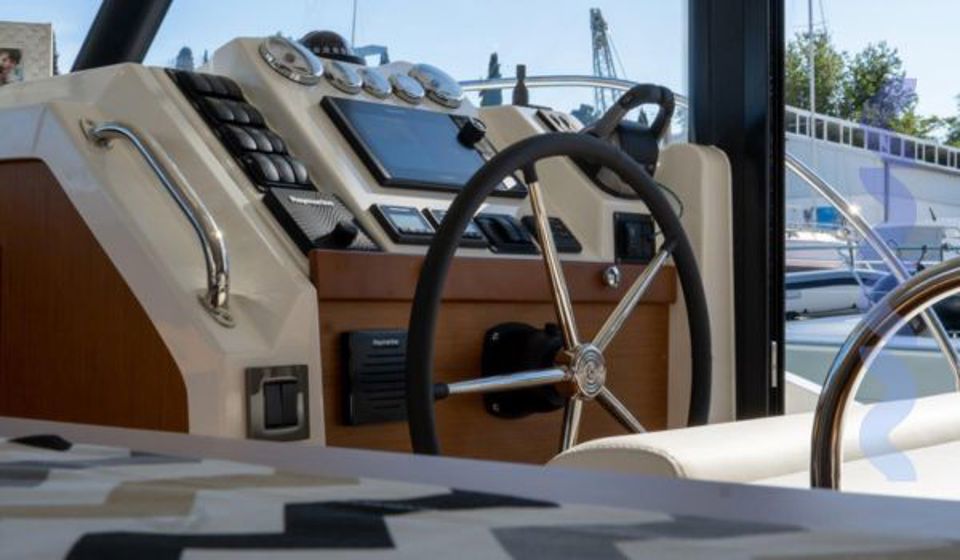 The flybridge features a bimini sun cover and integrated grill, creating an ideal space for relaxed cruising and outdoor living with panoramic views. Full navigation electronics, VHF, and onboard entertainment system ensure safety, control, and comfort throughout every passage.