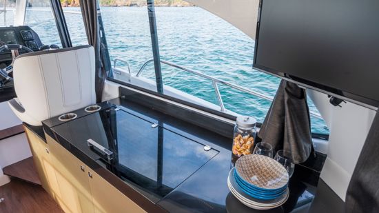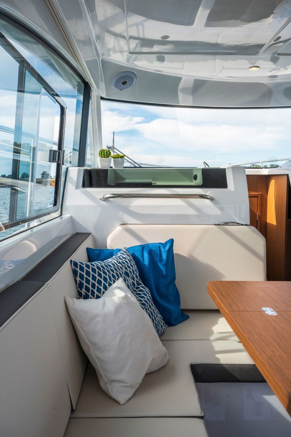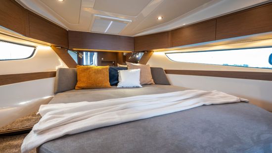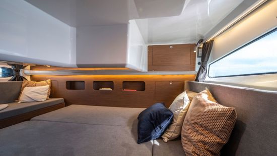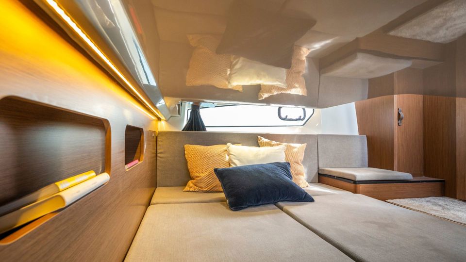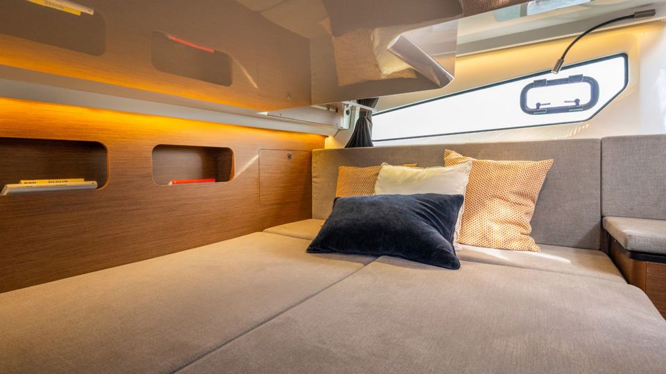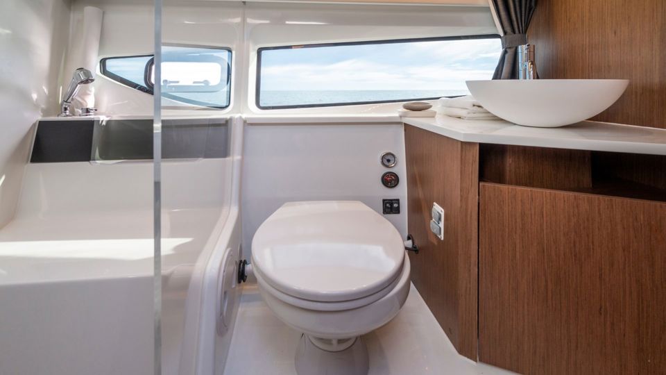 This 2026 configuration features the Comfort trim level with an electric windlass, extended swim platform, 25L water heater, full 220V electrical circuit with battery charger, LED courtesy lighting throughout the cockpit and cabins, and a portside sliding window for natural airflow.