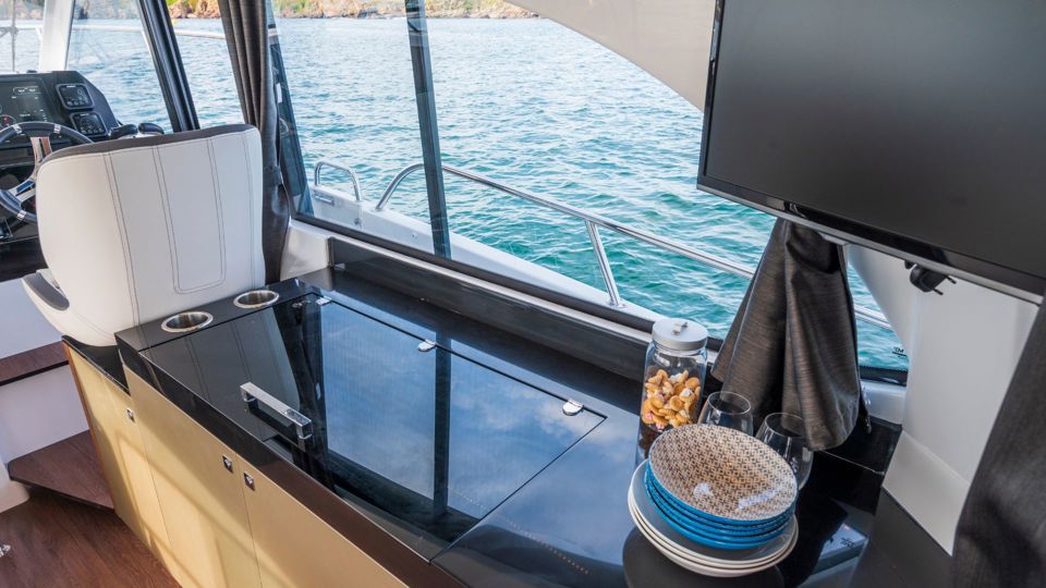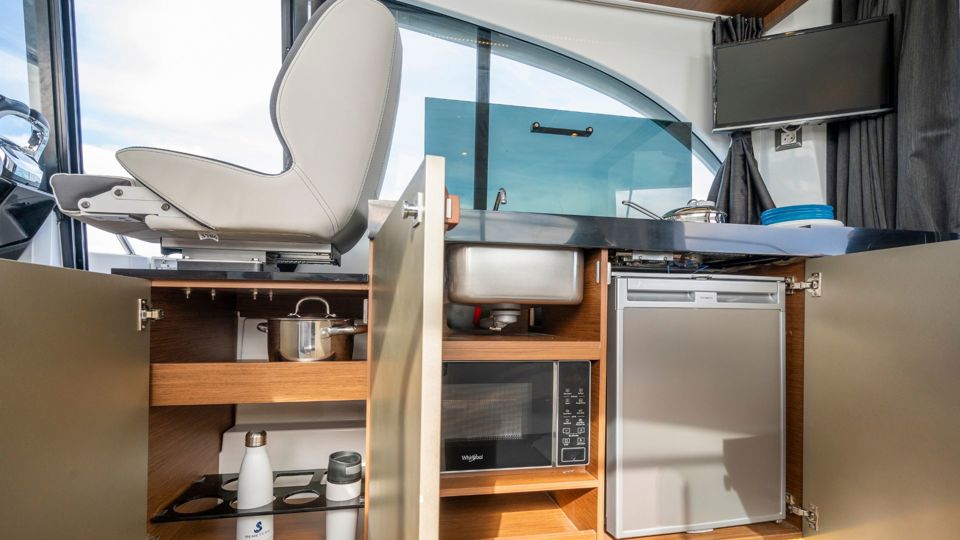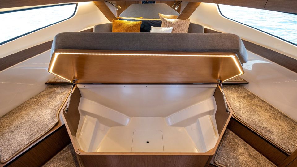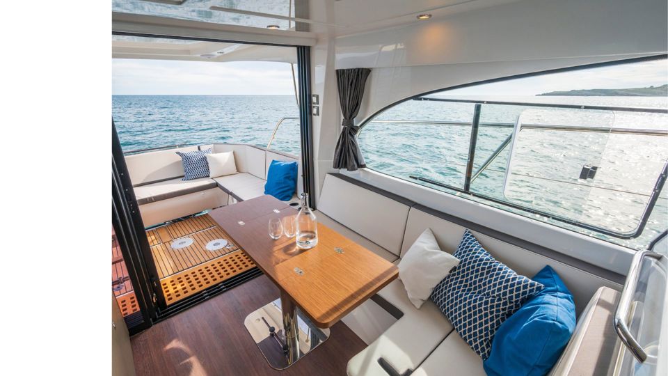 Outdoor living is elevated with the Pure upholstery package, including a convertible cockpit seating area, L-shaped lounge, forward sun deck with adjustable backrest, and protective canopy. Additional equipment includes a bow thruster, deck searchlight, mooring kit, side platform electrical system, extra 75L refrigerator on the lower deck, walnut table with telescopic leg, and enhanced storage solutions in the forward cabin.