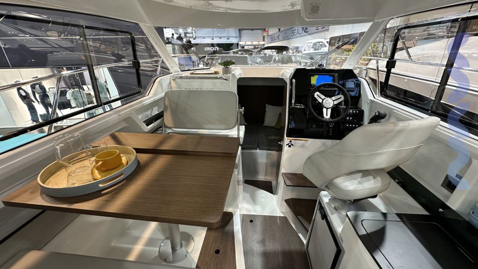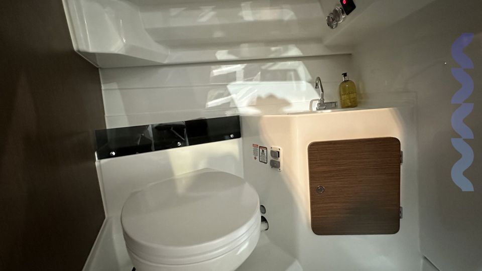 The spacious wheelhouse features a large sliding glass door, revealing a well-equipped living area. Below, a double cabin at the bow provides a comfortable bed, ample storage, a separate head, and an en-suite shower, making multi-day stays effortless.