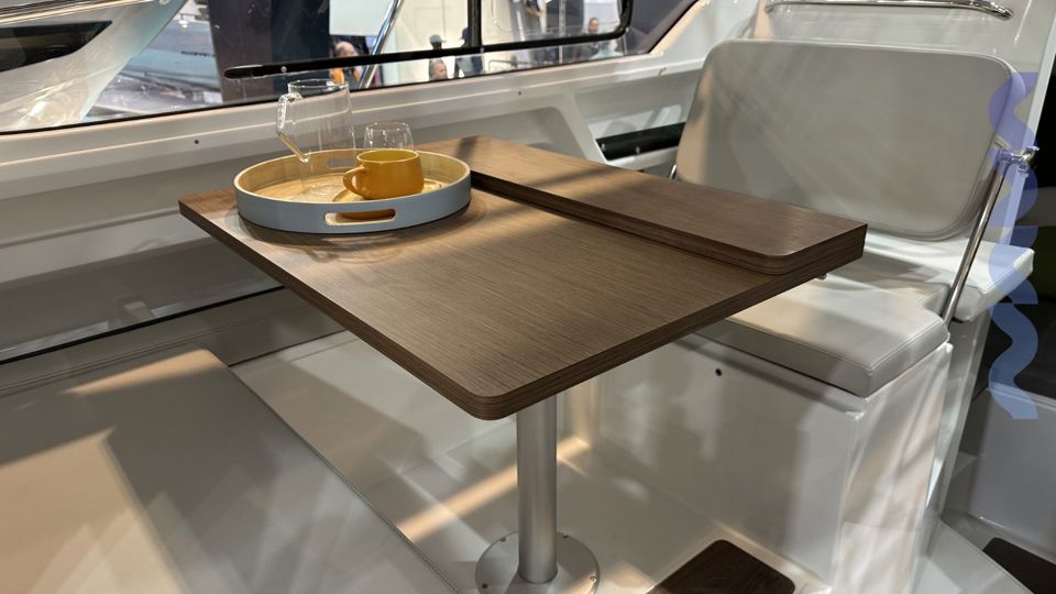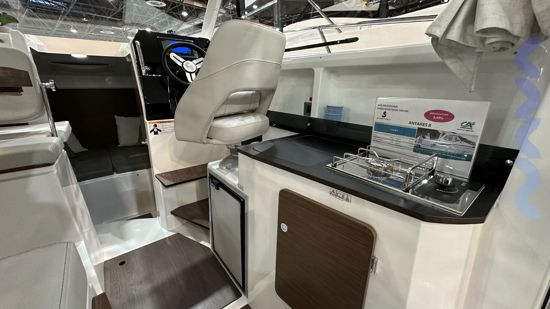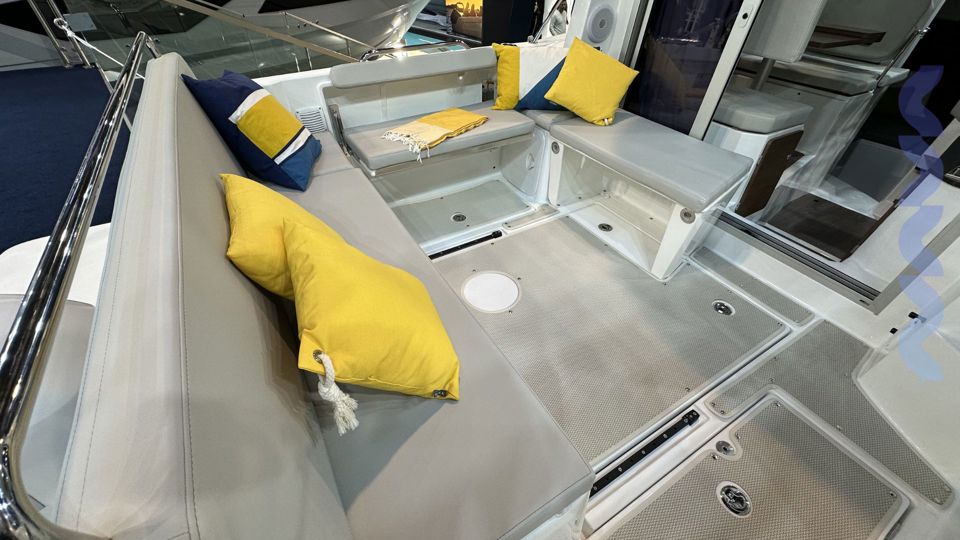 Optional packs include GARMIN electronics and a Fusion sound system, while exterior features include sun awnings, cushions, roof racks, bow thruster, and polyester bathing platforms. The luxury galley and 42L refrigerator complete a perfect balance of comfort and style.