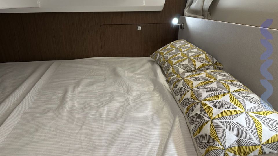 The boat features a forward owner’s cabin with a queen-size bed, a guest cabin for two, and a convertible saloon, offering accommodation for up to 6 people.