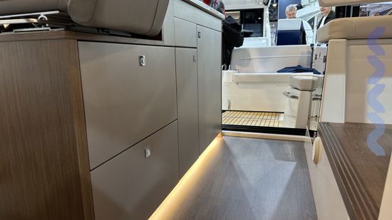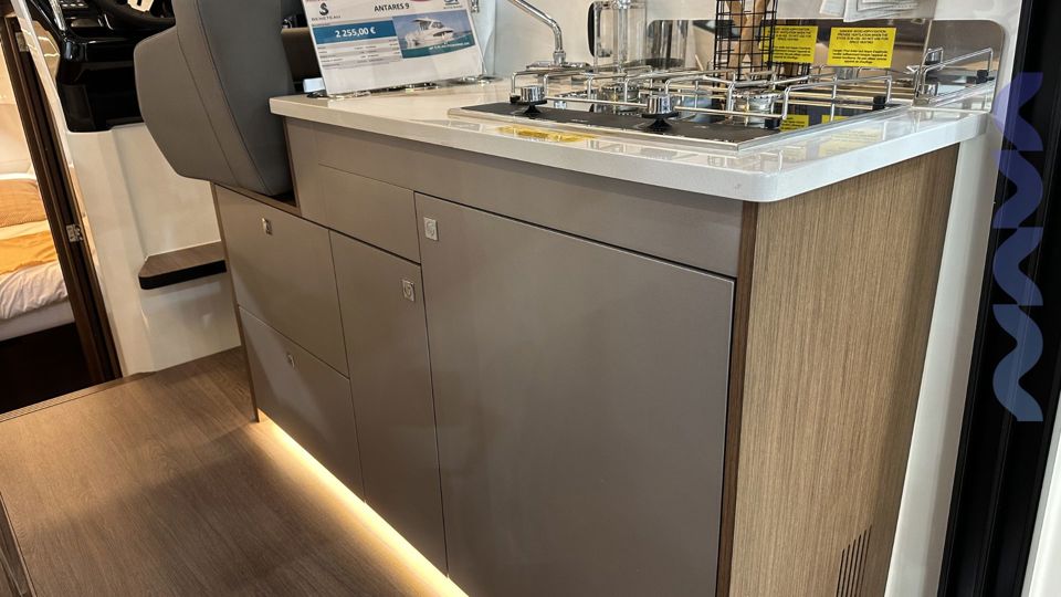 The bright saloon with large panoramic windows provides plenty of natural light, while the galley is equipped with an 80 L refrigerator, electric hob, and ample storage.