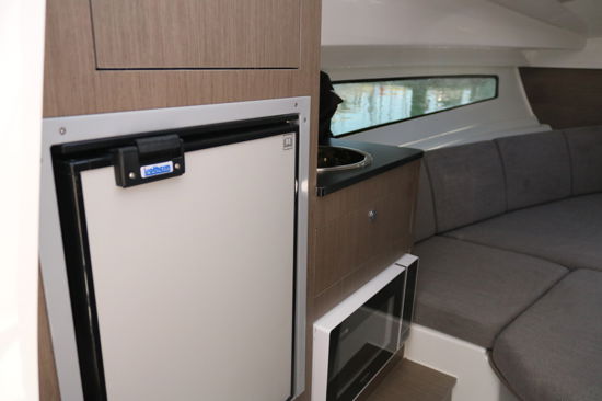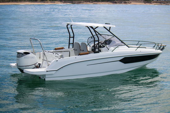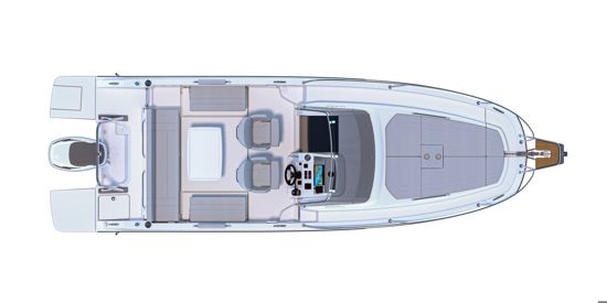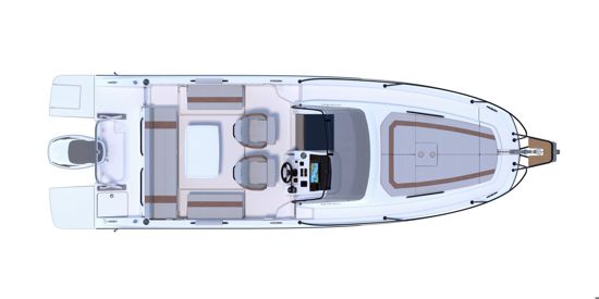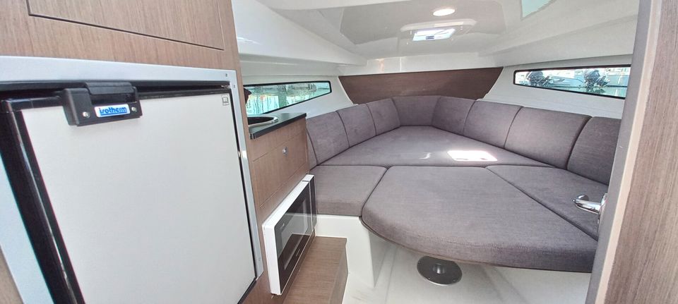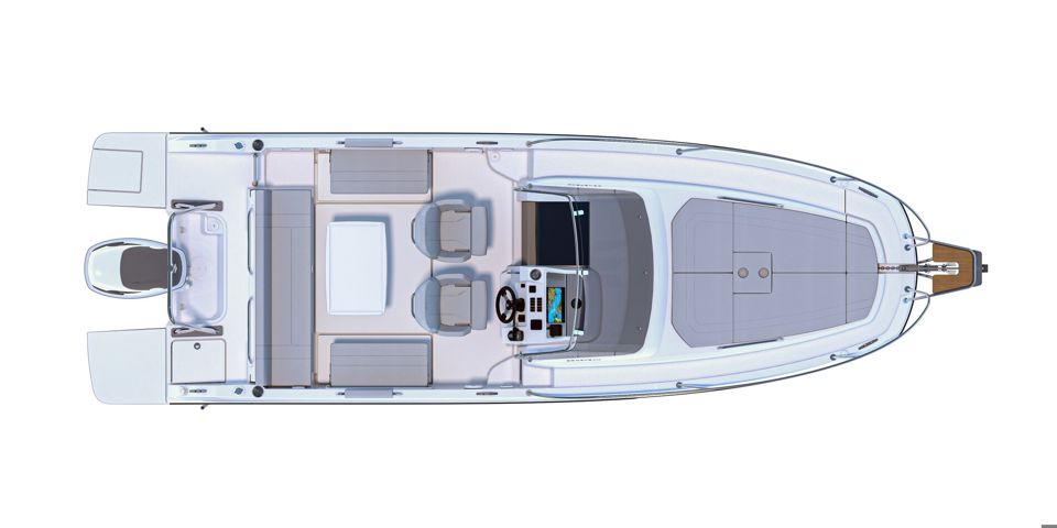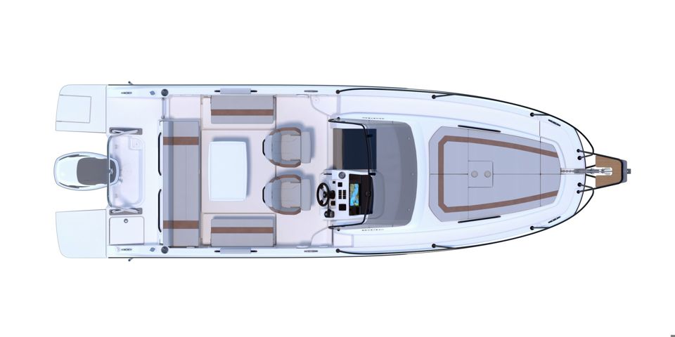 This model comes with Pilot Edition trim, a GRP cockpit table, LED courtesy lights, an electric windlass, and a 42L cabin fridge. Navigation is handled with Garmin electronics (Echomap UHD2 92sv + GT23 M-TM sensor), while entertainment is provided by Fusion MS-RA210 speakers. Comfort is enhanced with the Zipwake auto trim system, cockpit bimini, two foldable side seats, and a T-Top sun awning.