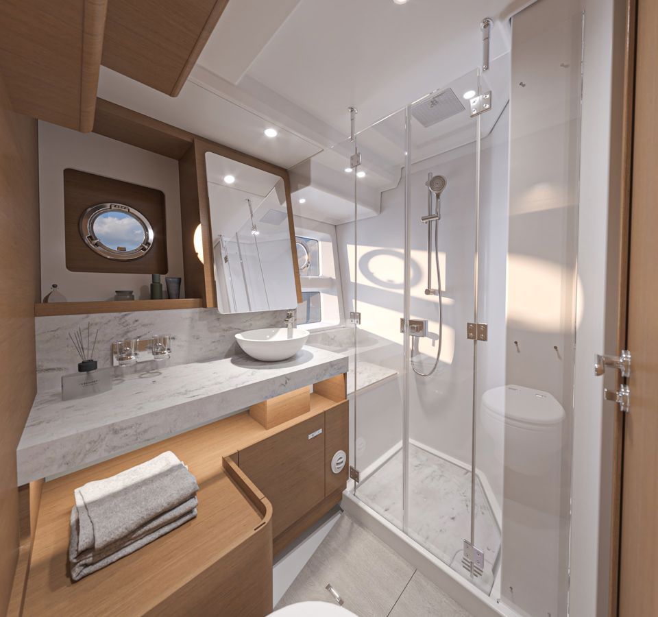 Below the galley and the saloon, six berths with the option for an additional single crew berth provide ample sleeping space for long family cruises. All cabins feature wardrobes with slatted doors, Berber style carpets and Corian countertops and flooring in the bathrooms, while the master cabin also features a rain shower in the ensuite bathroom.
