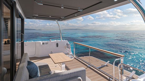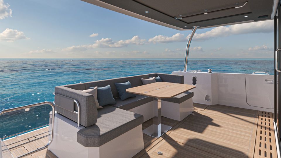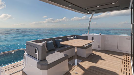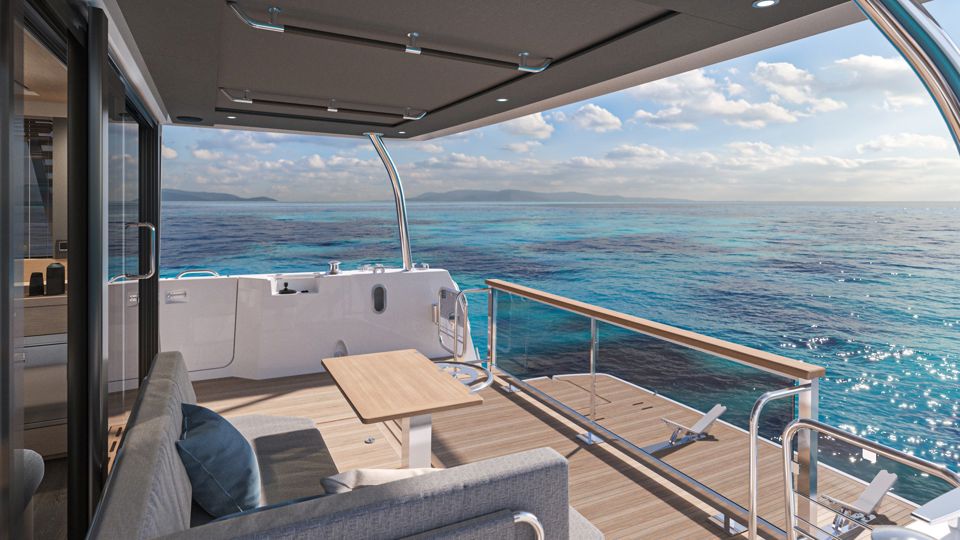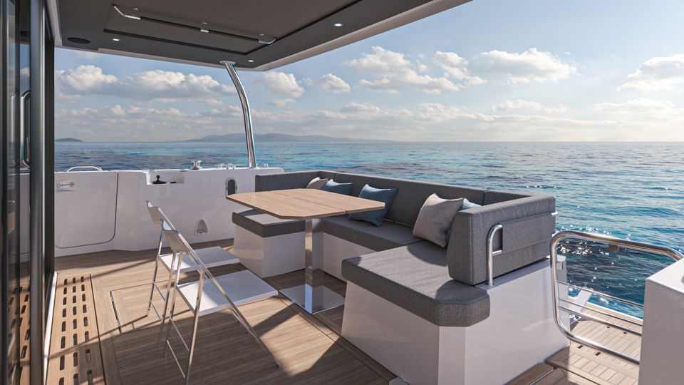 The visually stunning interior boasts an ergonomic and well-appointed galley with a raised dinette, a large saloon and an “architectural” flybridge stairs leading to a spacious flybridge with soft seating. The stern is equipped with 400kg tender lift, storage and a hydraulic swim platform with adaptive dinghy chocks. On the foredeck, the U-shaped seating area with an inset table easily converts into a huge sunpad, with additional storage underneath, offering total comfort.
