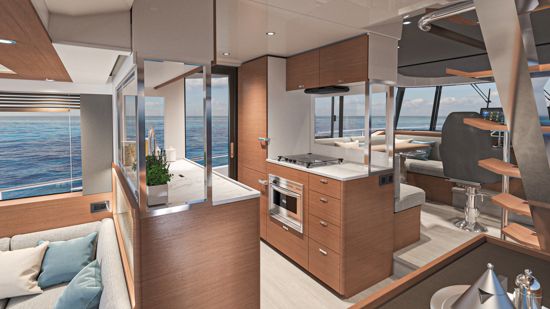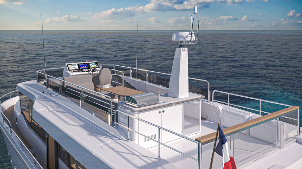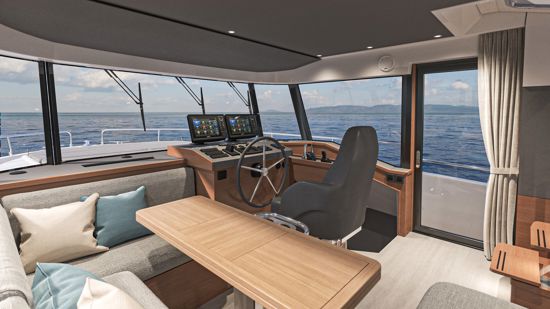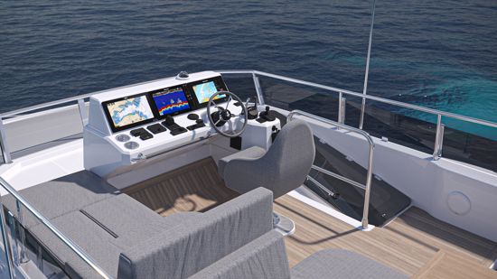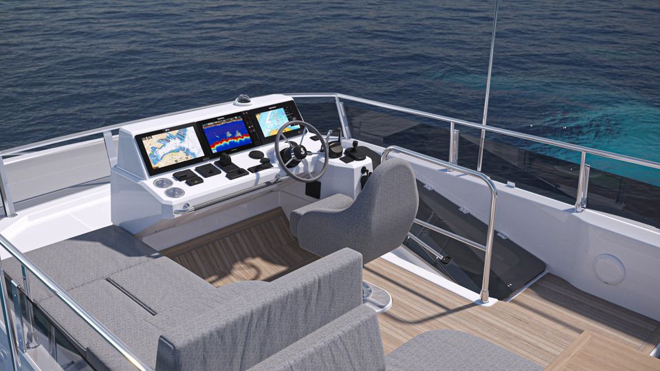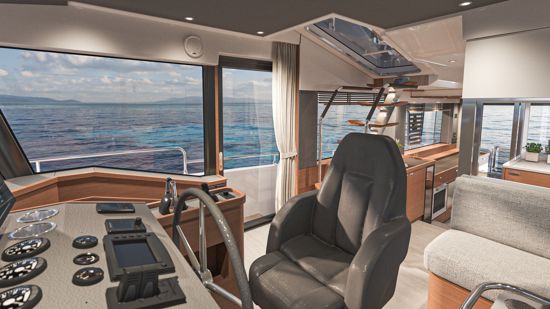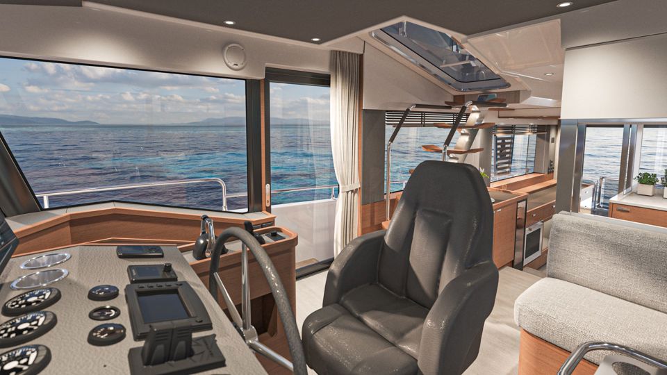 The design emphasizes safe and easy circulation between the helm, galley side doors and the 360 all-around panoramic wheelhouse windows, creating an open and inviting space.